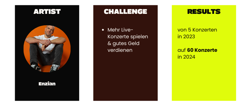 Unabhängig davon ob es das Thema Reichweite, Fan-Gewinnung, Gigs, Klarheit in deiner Artist Brand oder möglicherweise auch dein Mindset ist - wir haben genau dafür Lösungen, die erwiesenermaßen zu starken Ergebnissen führen.